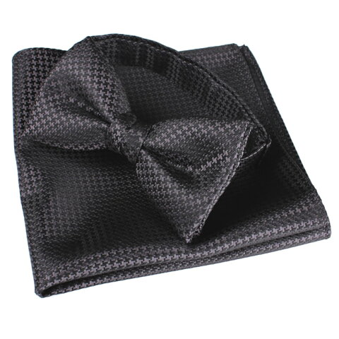 日本製 蝶ネクタイ シルク ジャガード 蝶タイ ボウタイ 蝶ネクタイ チーフ・ポケットチーフ セット ブラック 千鳥格子 礼装・フォーマル・発表会・音楽会・結婚式・社交ダンス・晩餐会・パーティ メンズ・紳士・男性