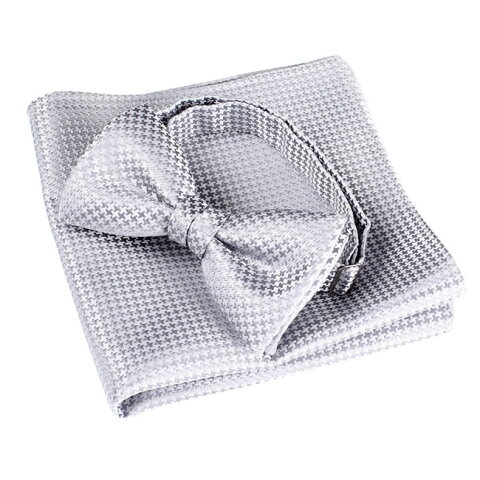 日本製 蝶ネクタイ シルク ジャガード 蝶タイ ボウタイ 蝶ネクタイ チーフ・ポケットチーフ セット シルバーグレー 千鳥格子 礼装・フォーマル・発表会・音楽会・結婚式・社交ダンス・晩餐会・パーティ メンズ・紳士・男性